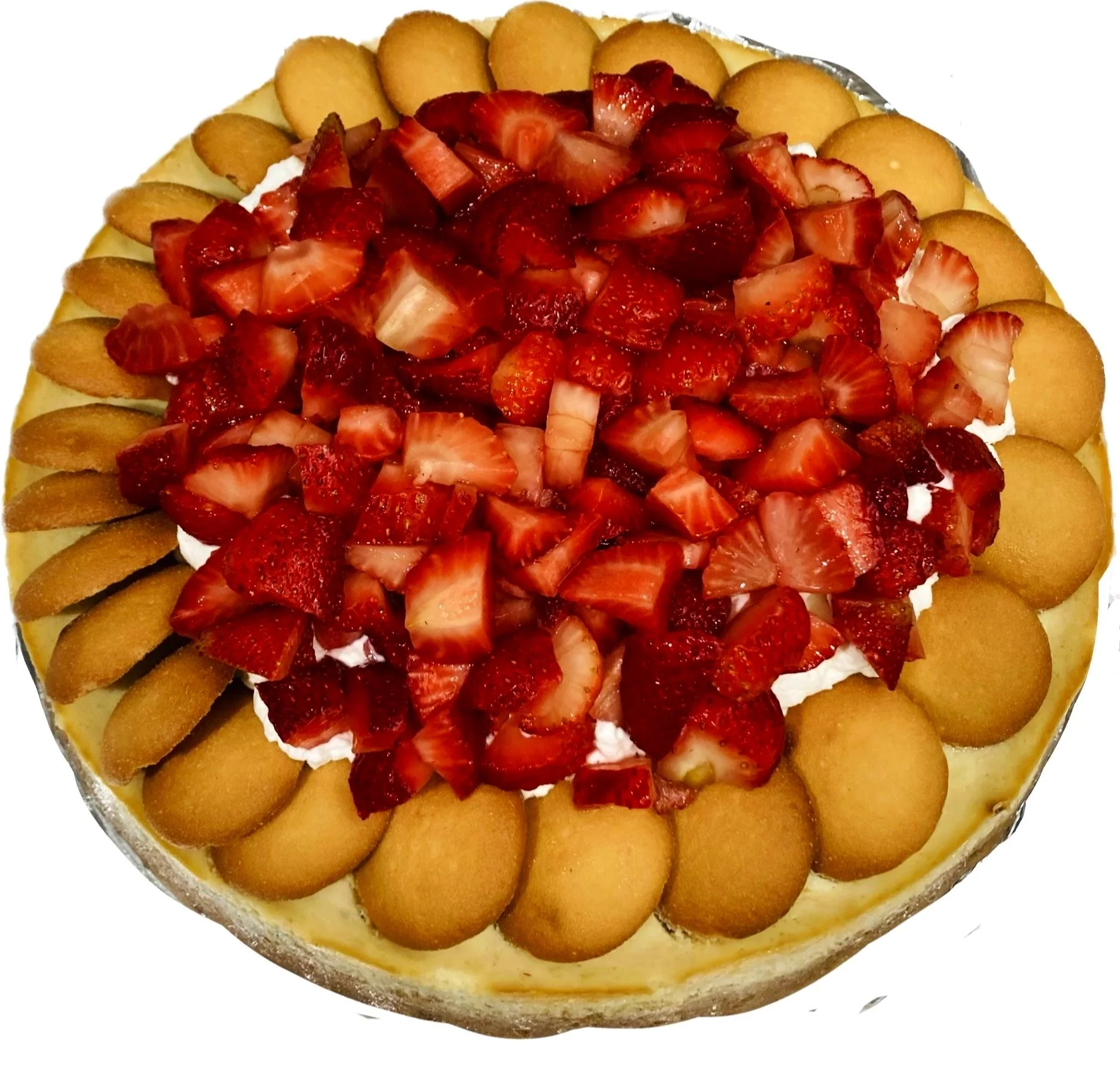 Banana infused cheesecake with a vanilla wafer cookie crust, topped with fresh strawberries
